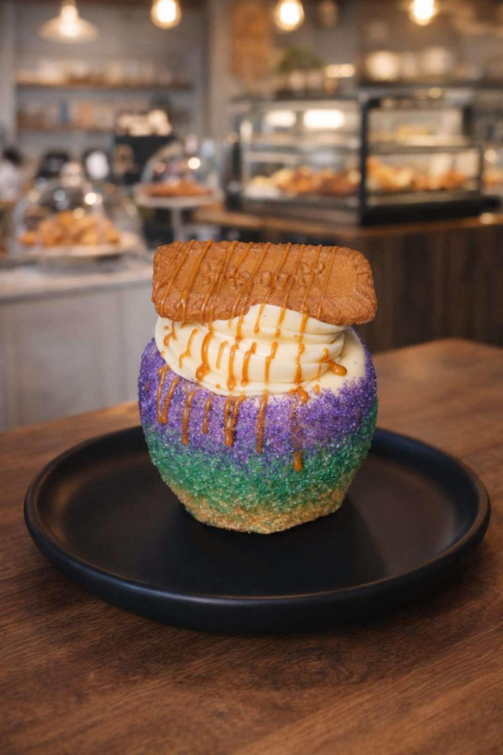 A banana lover’s dream! This cheesecake apple is dipped in white chocolate, coated in a mix of crushed Nilla Wafers and Chessmen butter cookies, then filled with banana pudding flavored no-bake cheesecake. Finished with a buttery Chessmen cookie on top and a sweet caramel drizzle.